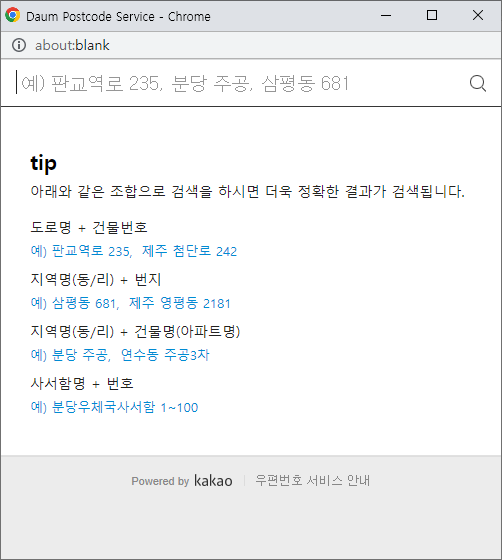 우편번호 검색과 도로명 주소 입력 기능을 너무 간단하게 적용할 수 있는 방법. Daum 우편번호 서비스를 이용해보세요. 어느 사이트에서나 무료로 제약없이 사용 가능하답니다.