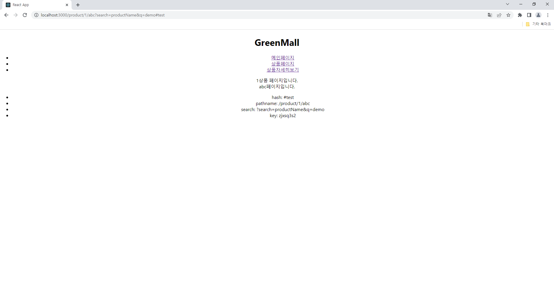 <li><Link to="/product/1/abc?search=productName&q=demo#test">1번상품</Link></li>