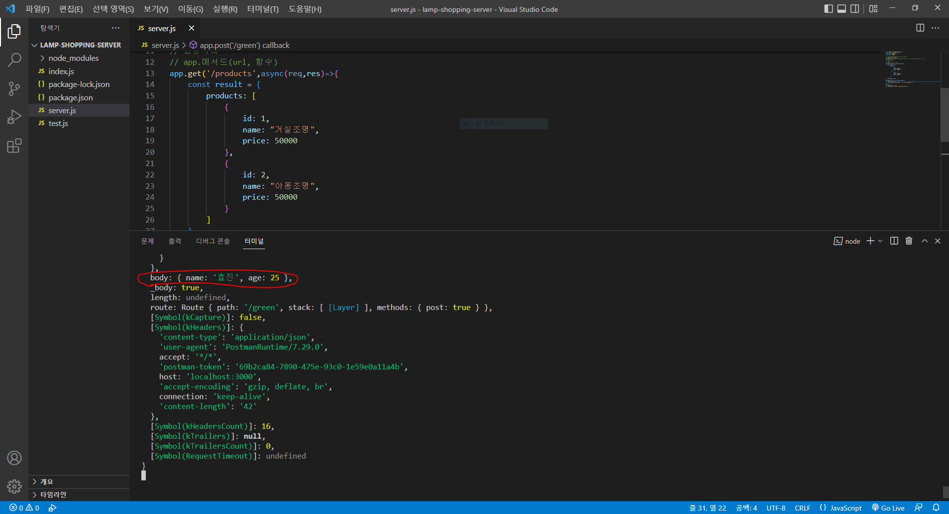 서버는 웹브라우저로 보지 않고 터미널에 node ~ 치기
