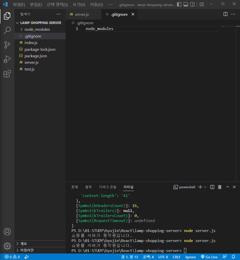 server에는 .gitigore 파일이 없어서 만들기 (git에 안올릴 파일들을 적어놓는 파일)
