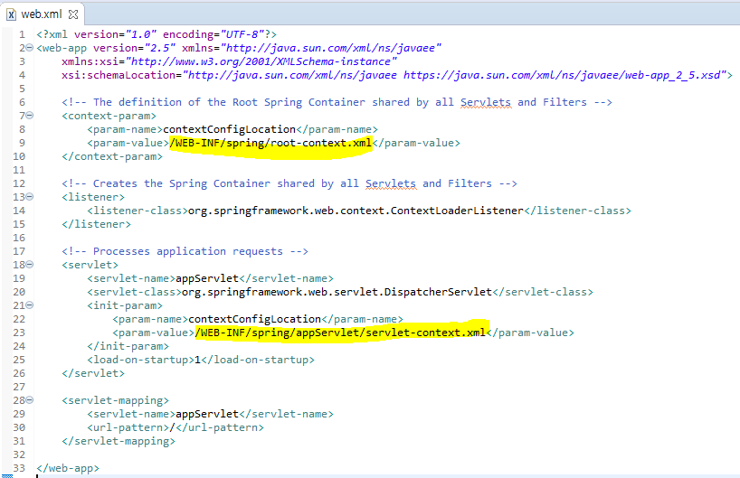 여기에서 root-context.xml과 servlet-context.xml을 지정해준다.