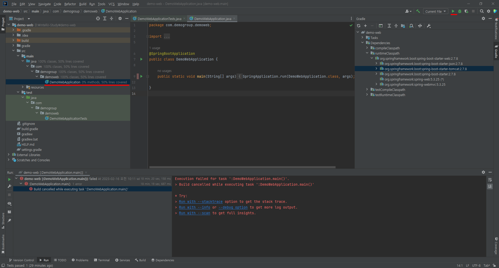 저!!! 애플리케이션 있는 저 파일(main/java/com/demogroup/demoweb)을 열고 Run을 누르면!!