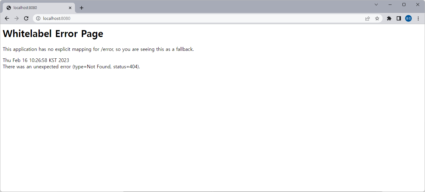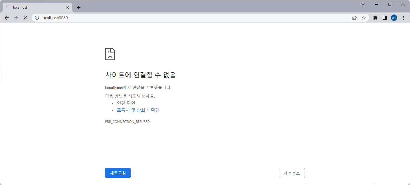 저 화면은 localhost:8080 서버가 실행 안 돼서 뜨는 화면이다