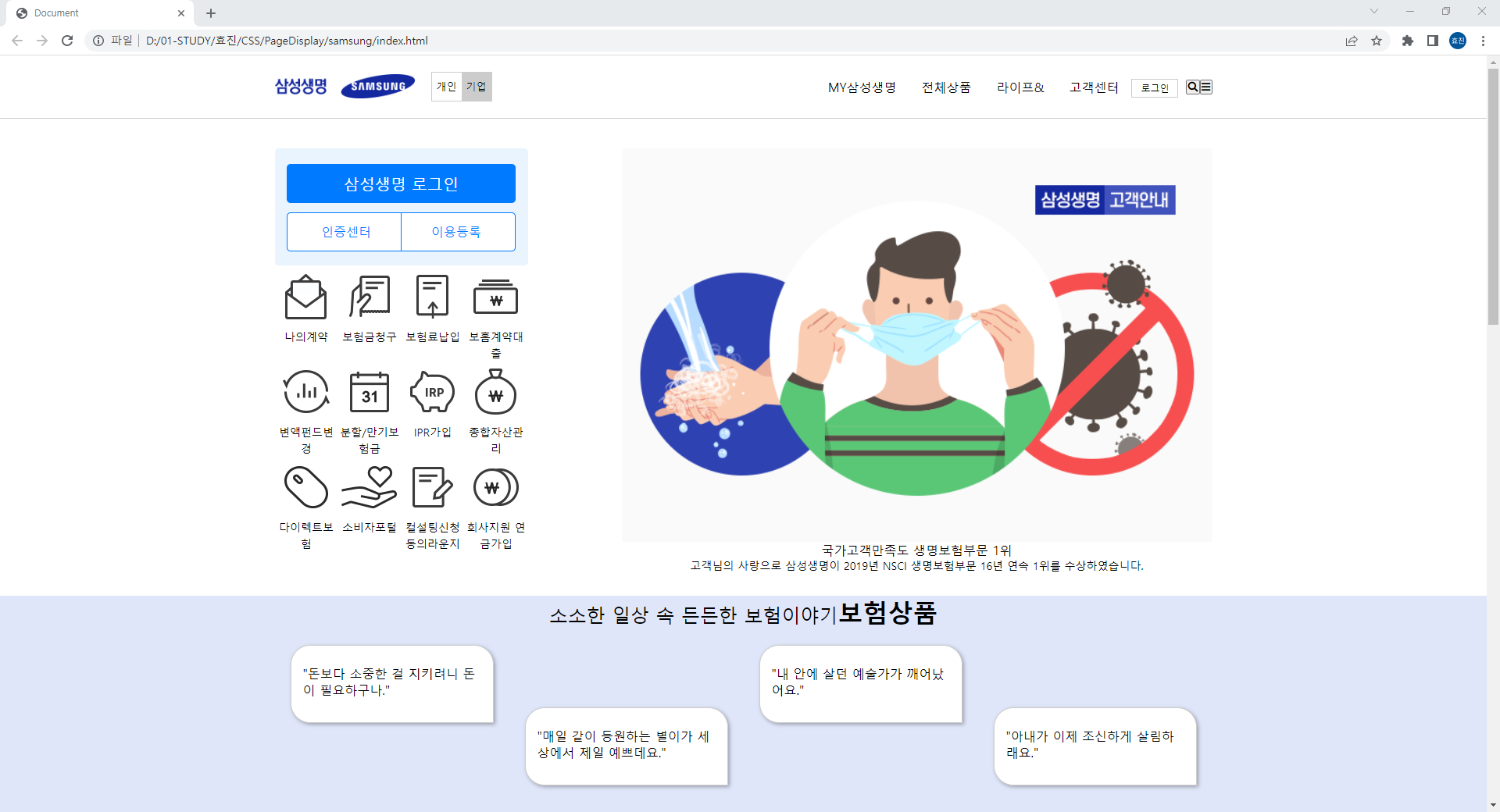 <p>고객님의 사랑으로 삼성생명이 2019년 NSCI 생명보험부문 16년 연속 1위를 수상하였습니다.</p>